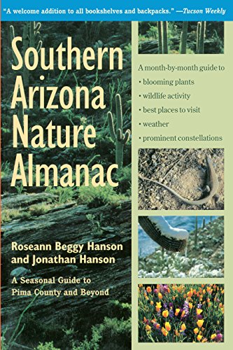 2 of 2 people found the following review helpful. A Personal Account of a Great County By David B Richman I spent five years in Pima County, while I attended the University of Arizona. During that time I roamed over much of the area, as well as the surrounding counties, looking for beetles and arachnids, bird watching, and during one very productive spring, making a plant collection for a course in systematic botany. The huge county (9000 square miles - almost nine Rhode Islands!) varies from low desert at the start of the Camino del Diablo near Ajo to high mountain forests up to over 9,000 feet elevation in the Santa Catalina Mountains above Tucson and covered with Douglas fir, ponderosa pine, bigtooth and Rocky Mountain maples, and aspen. It does indeed deserve its own book.Roseann Beggy Hanson and Jonathan Hanson have published just such book and I hardily recommend their "Southern Arizona Nature Almanac" to anyone living in or visiting the area. The book cover all sorts of subjects, many not found in other books on the areas involved. My only gripe is their lack of coverage for the Arachnida, as they seem to barely mention scorpions and spiders (mostly as food for vertebrates), while discussing rattlesnakes, lighting safety, rabies in bats, Africanized bees, and other safety issues. As an arachnologist I'm a bit prejudiced, but I do think that visitors should be warned about avoiding scorpions, violin spiders and black widows! Still this is more a personalized almanac than exactly a guidebook. Fortunately there are several excellent volumes for the Sonoran Desert (which makes up much of the county) to consult. In any case the book has a large amount of information in it on the flora, fauna and night skies of locations, such as the Buenos Aires and Cabeza Prieta National Wildlife Refuges, Baboquivari, the Rincon Mountains, the Quinlan Mountains, and Rose Canyon Lake,among others, with which I am very familiar.Such a book is to be read and savored as a taste of places and organisms that can be seen in this remarkable county. Buy this book to get the flavor of the area and pick up a few guides (such as the Arizona-Sonora Desert Museum's "A Natural History of the Sonoran Desert") and you will be well served.